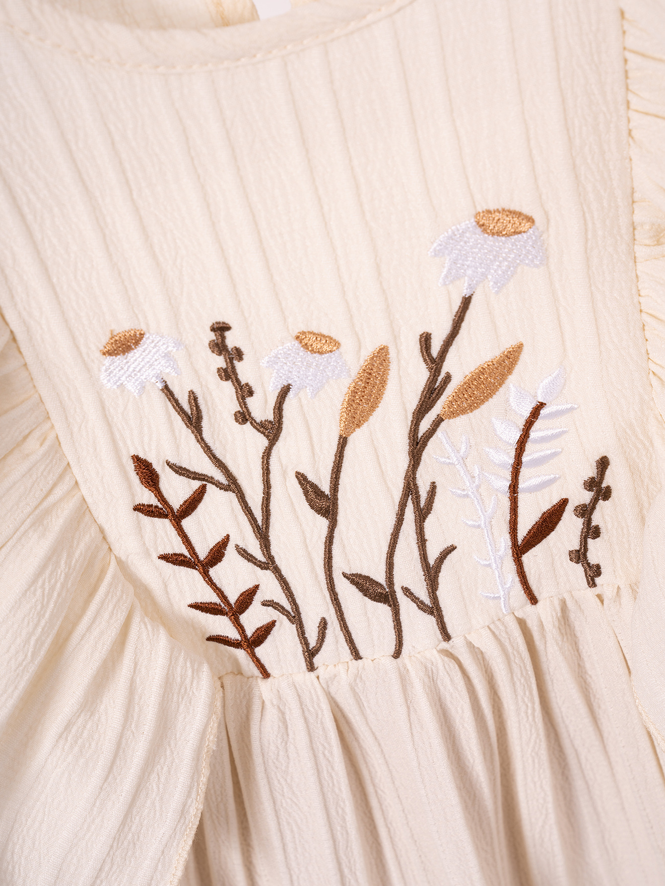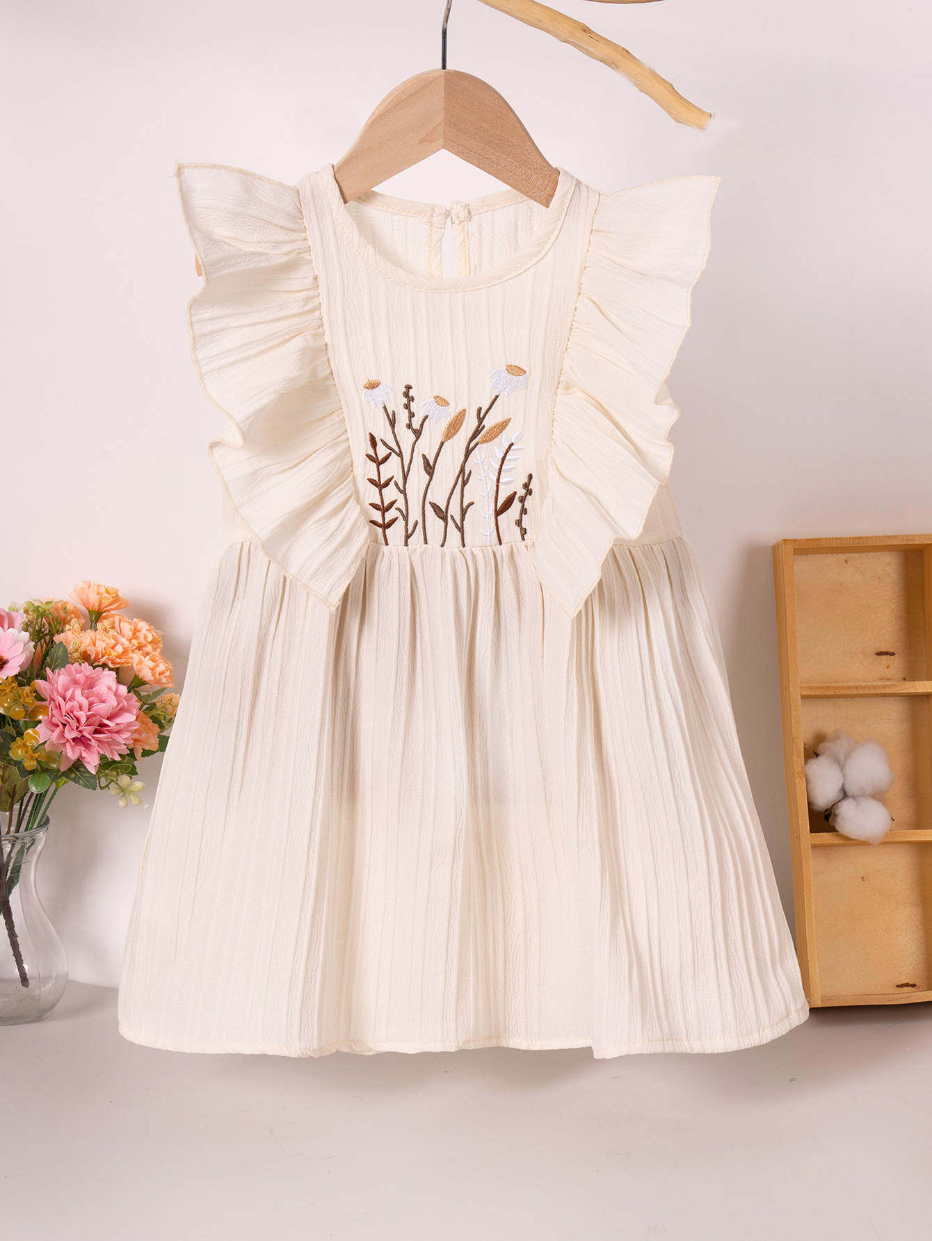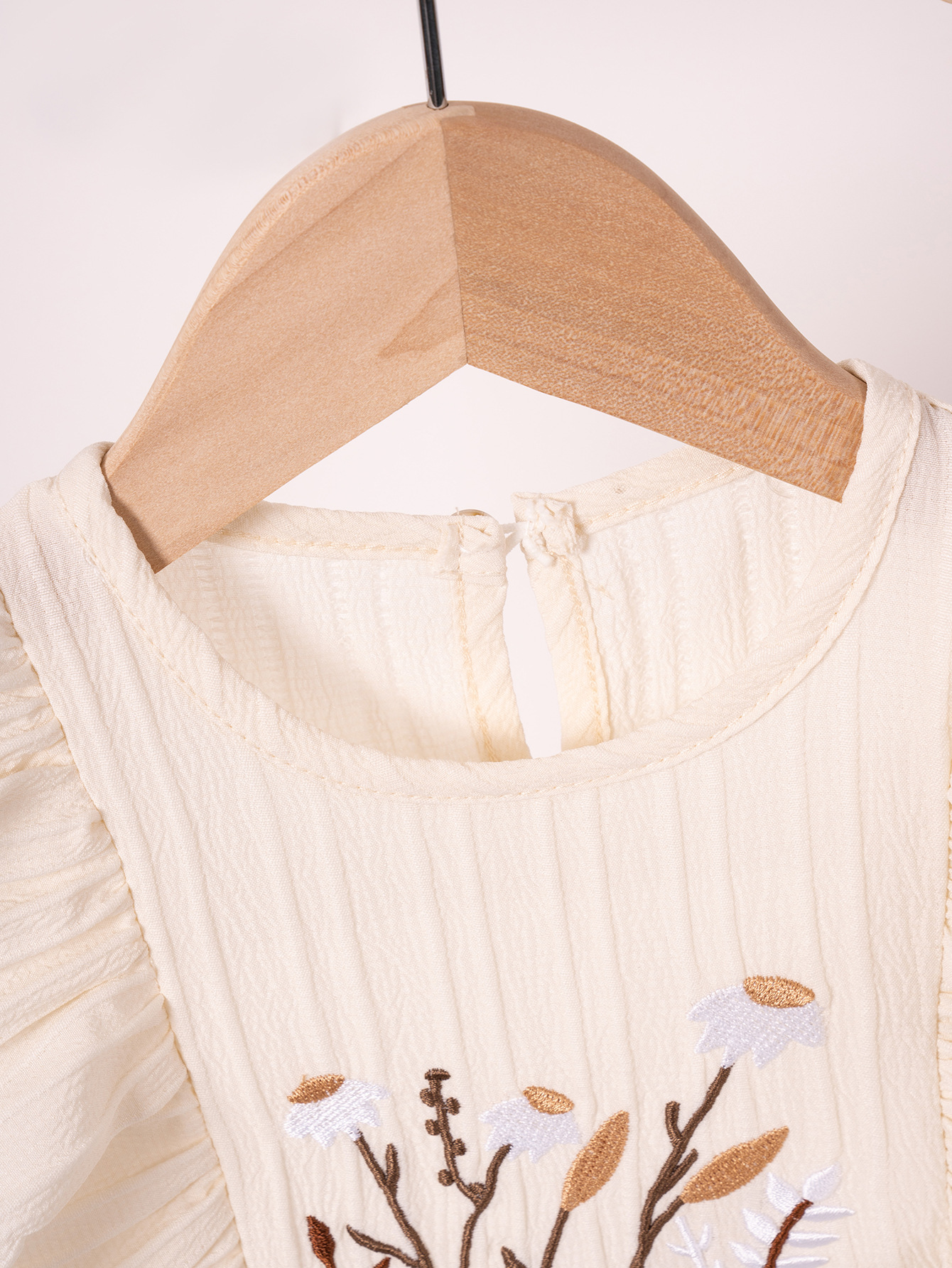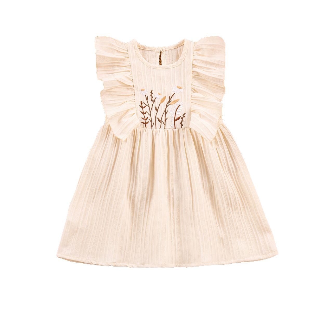 2025 Summer New Girls' Dress Embroidered Small Flower Small Flying Sleeve Pastoral Sweet Thin Solid Color Round Neck Pullover
