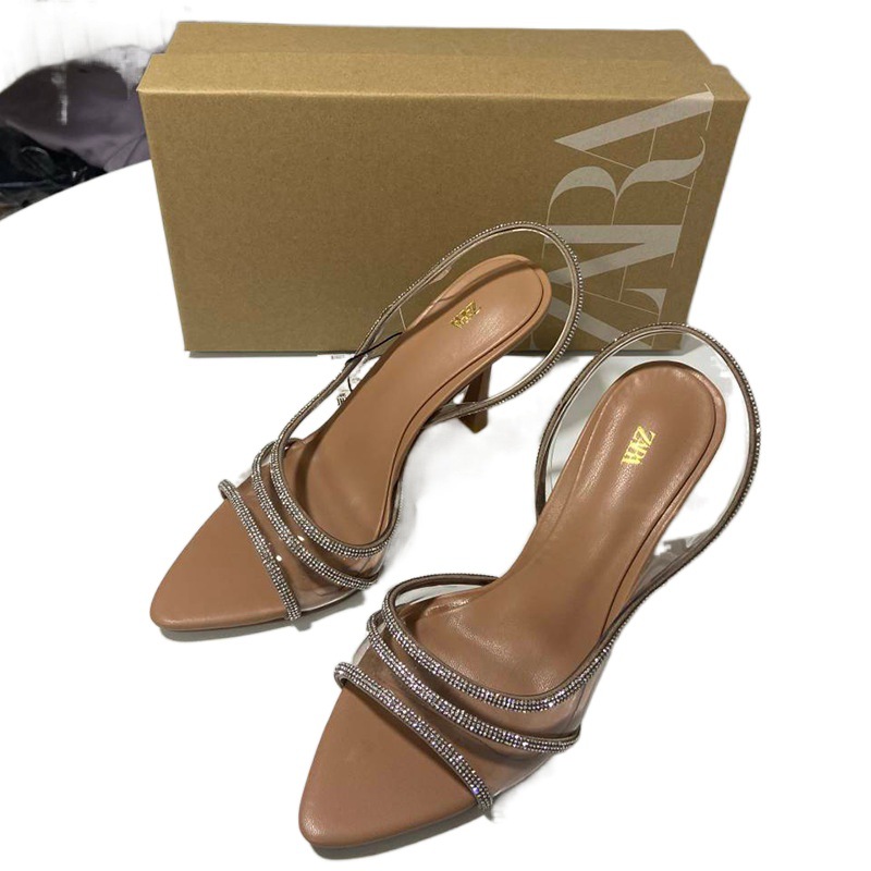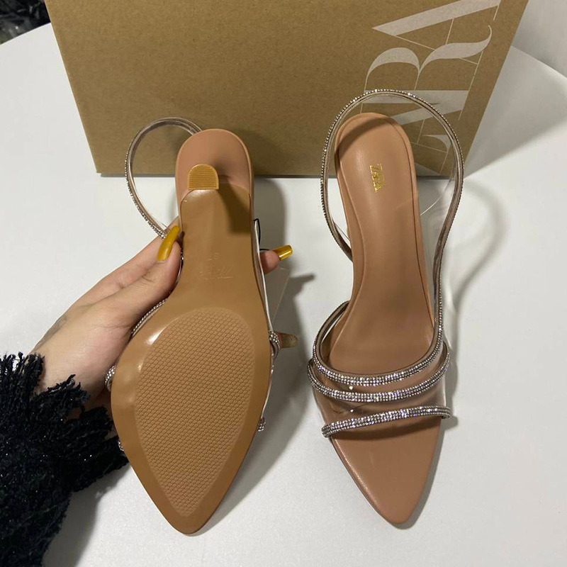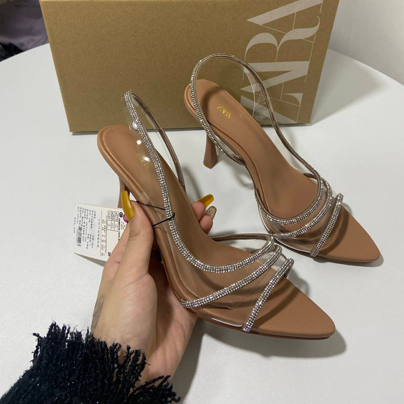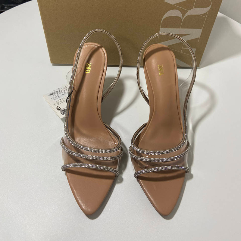 ZA New 2024 Summer Pointed Stiletto Heel Rhinestone Sandals Women's Shallow Mouth Chain Litter Open Toe Hare High Heels For Women
