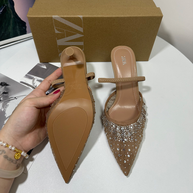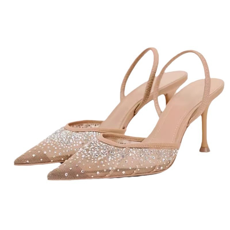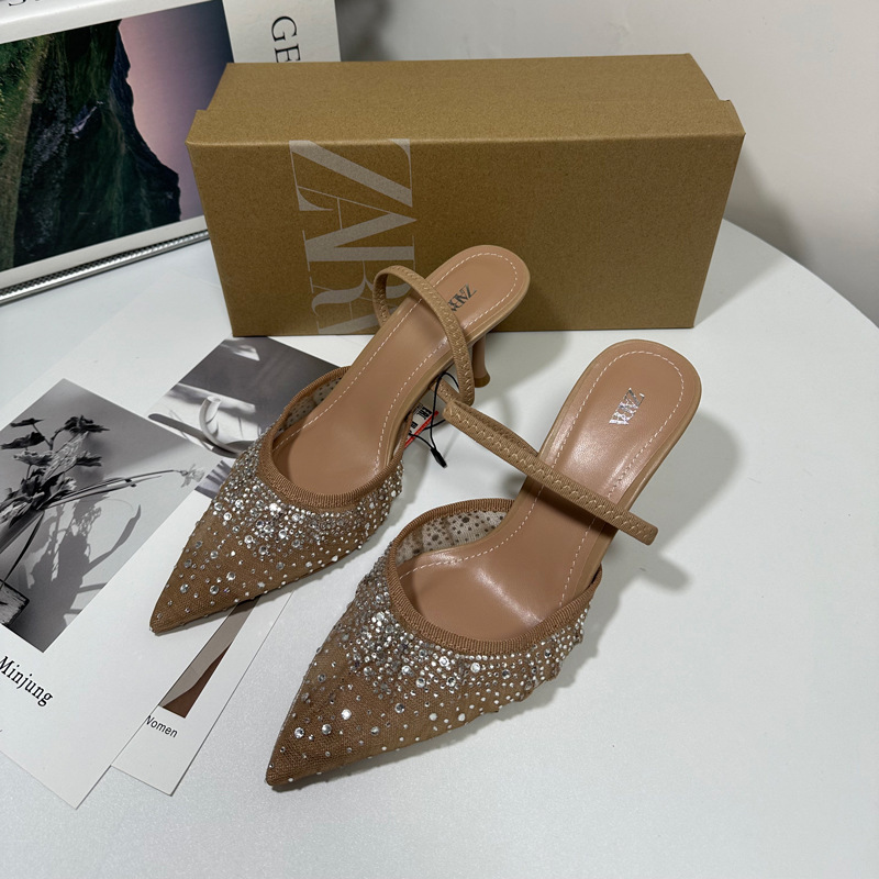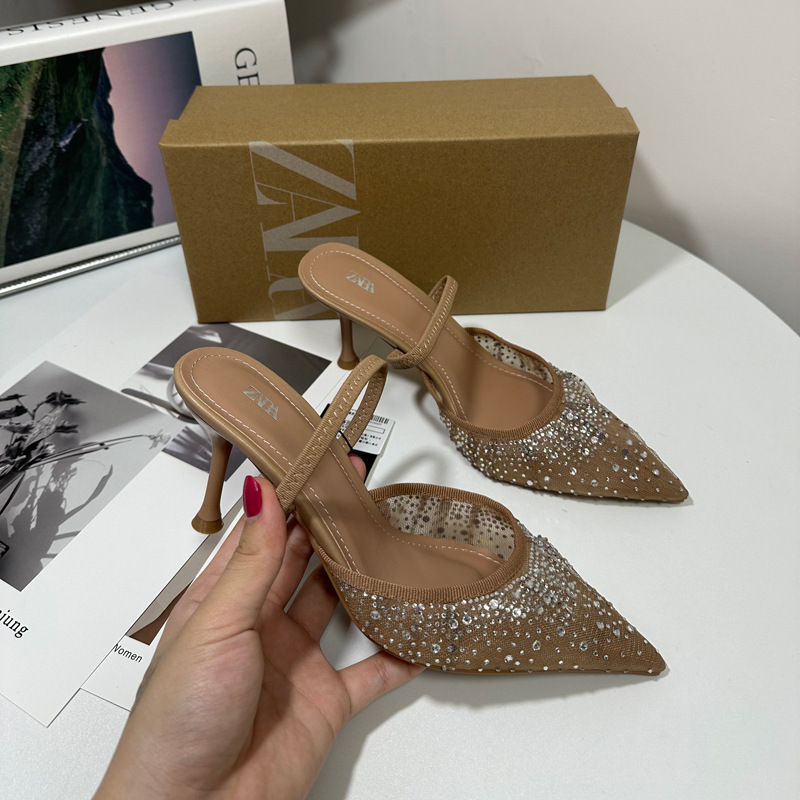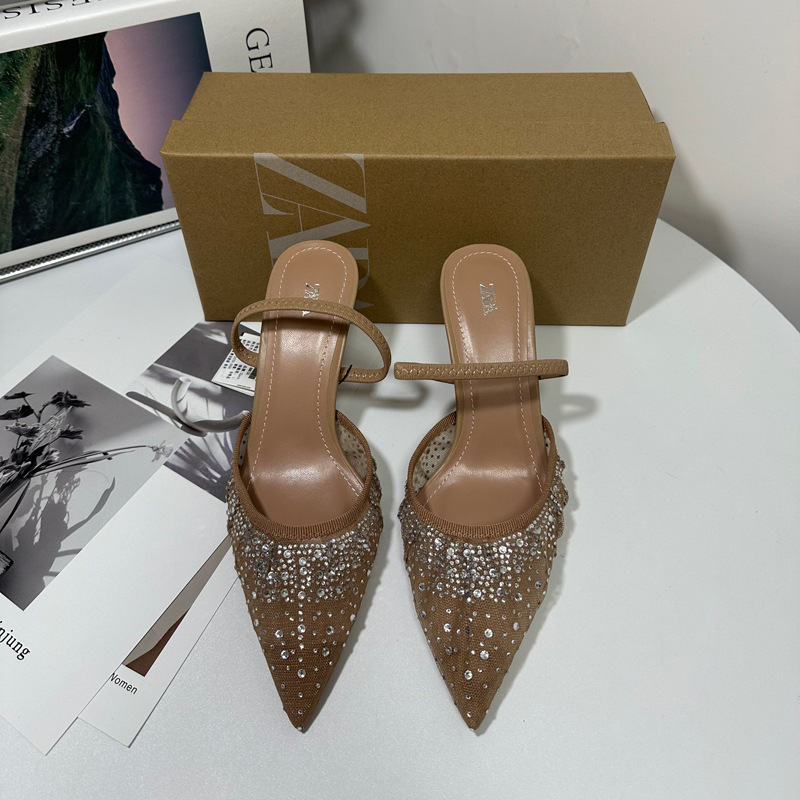 ZAKQ Summer New 2025 Mesh Breathable Pointed Stiletto Heel Baotou Rear Strap Pressure Drill Heel High-heeled Sandals