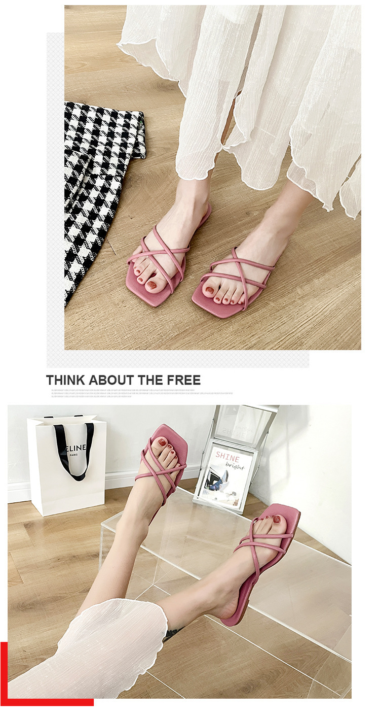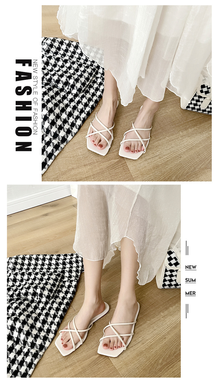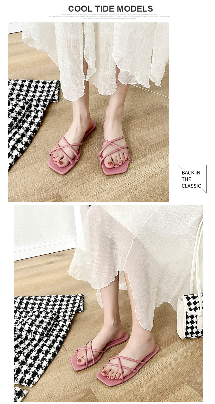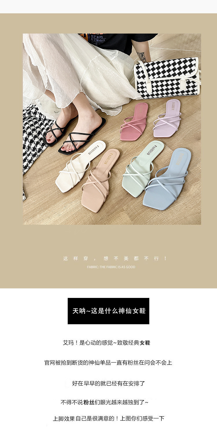 Fairy Style Slippers Women's New Summer Outer Wear Korean Style Simple Thin Strap Square Toe Flat Beach Slippers Trendy